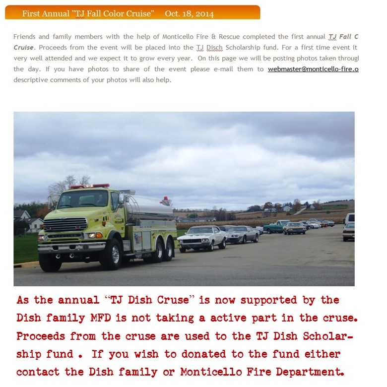 Proudly serving the Monticello Area since 1892 with Fire and First Responder services. Our service area is 80+ Sq. Miles with about 3500 total population. We are primarily a rural farming area. Our department will average 110 - 140 calls a year with about 70 % being First Response calls. We do not run a ambulance out of our station; instead we rely on the surrounding EMS units for transport and continuing patient care. We average about 32-36 members with over half of these being either Certified First Responders or EMT'S. We currently have a ISO rating of 3 for the Village and a class 6/10 rating for the rural area.