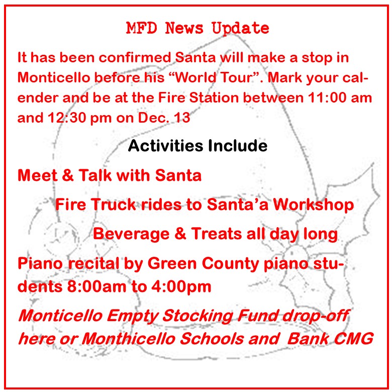 Proudly serving the Monticello Area since 1892 with Fire and First Responder services. Our service area is 80+ Sq. Miles with about 3500 total population. We are primarily a rural farming area. Our department will average 110 - 140 calls a year with about 70 % being First Response calls. We do not run a ambulance out of our station; instead we rely on the surrounding EMS units for transport and continuing patient care. We average about 32-36 members with over half of these being either Certified First Responders or EMT'S. We currently have a ISO rating of 3 for the Village and a class 6/10 rating for the rural area.